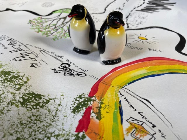 Salt and Pepper is a group of LGBTQ+ elders who met on the park benches of west Cork for the month of May. In June we brought the collected stories into the workshop at Uillinn to create this exhibition. Artist Toma McCullim worked with her peers to create collective artworks which muse on our life journeys. The willow tree will bow but not break talks about acts of memorial. The red ribbons remind us of the tragic toll of AIDS took. Now hung on the tree in the Irish folk tradition they represent rituals of healing. This is the map started from a conversation about the young us that had no idea of what life would have in store as we grew older. I was the only lesbian I knew. There was no map...only... ‘beyond here be monsters’